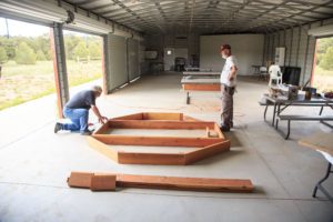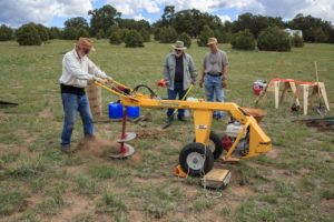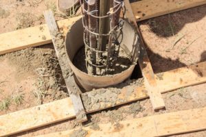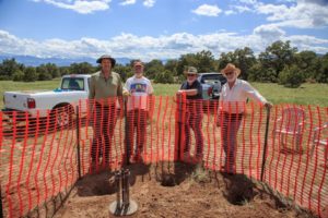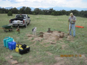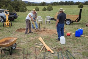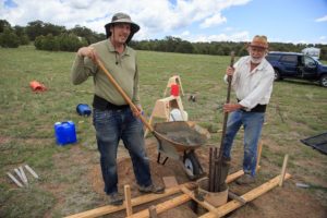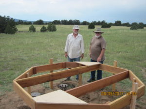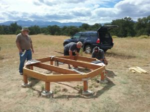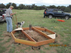 To ensure the concrete footers were properly placed, Tom constructed a set of risers that temporarily elevates the observatory deck a few feet off the ground – giving us working room to expand the holes as needed. Using a plumb we positioned the forms and Randy and Scott mixed and poured concrete into them. Tom followed after using the plumb to precisely position the anchor bolts into the concrete.